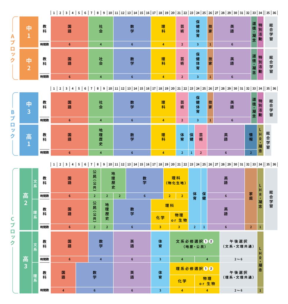 授業カリキュラム | Aブロックカリキュラム 6 年制カリキュラム1 2 | BブロックⅠ カリキュラム 6 年制カリキュラム3 (ほぼ高校内容に移行) | BブロックⅡ カリキュラム 6 年制カリキュラム4 | CブロックⅠ カリキュラム 6 年制カリキュラム5 | CブロックⅡ カリキュラム 6 年制カリキュラム6 | ||||||||
