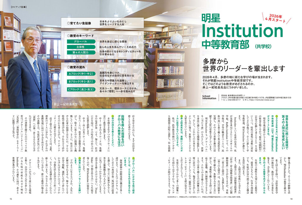 教育情報誌「サクセス12 2025年5・6月号」にて、2026年4月に開設する「明星Institution中等教育部」が紹介されました。記事では、井上一紀校長が新しい学びの理念や教育方針について語っています。創立100年以上の歴史を持つ明星学苑が掲げる校是「実践躬行」のもと、生徒の主体性を育み、グローバル社会で活躍できる人材の育成を目指す取り組みが紹介されています。
