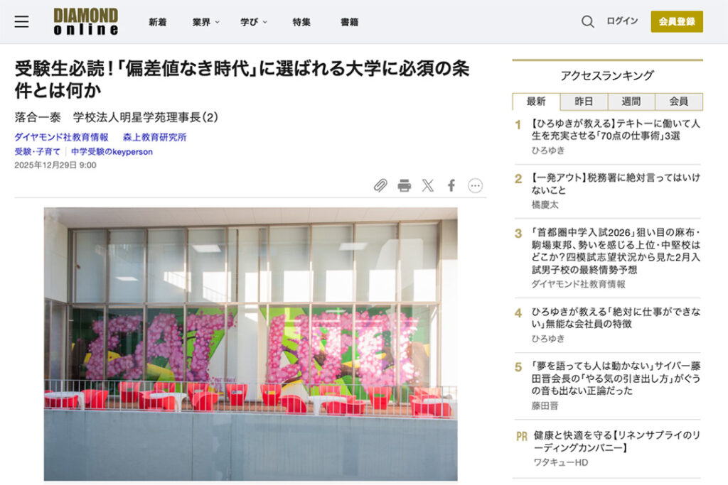 前回の記事(「DIAMOND online」(12月4日)に本校の記事が掲載されました)に引き続き、学校法人明星学苑 落合一泰理事長が、大学を取り巻く環境の変化についてさらに掘り下げてご紹介します。
