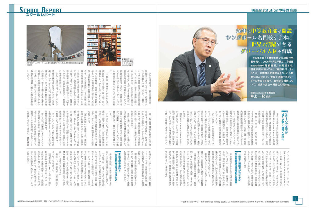 本記事では、一般生と帰国生・国際生が同じクラスで学び、生きた英語と多文化に日常的に触れる学習環境や、6年間を3段階に分けて学力と人間力を育てる「3ブロック制」「MIシラバス」の特色が紹介されています。さらに、海外研修・第二外国語・芸術鑑賞・自主研究論文など多彩なプログラムや、海外大学進学に向けた専門的な進路支援体制も取り上げられています。