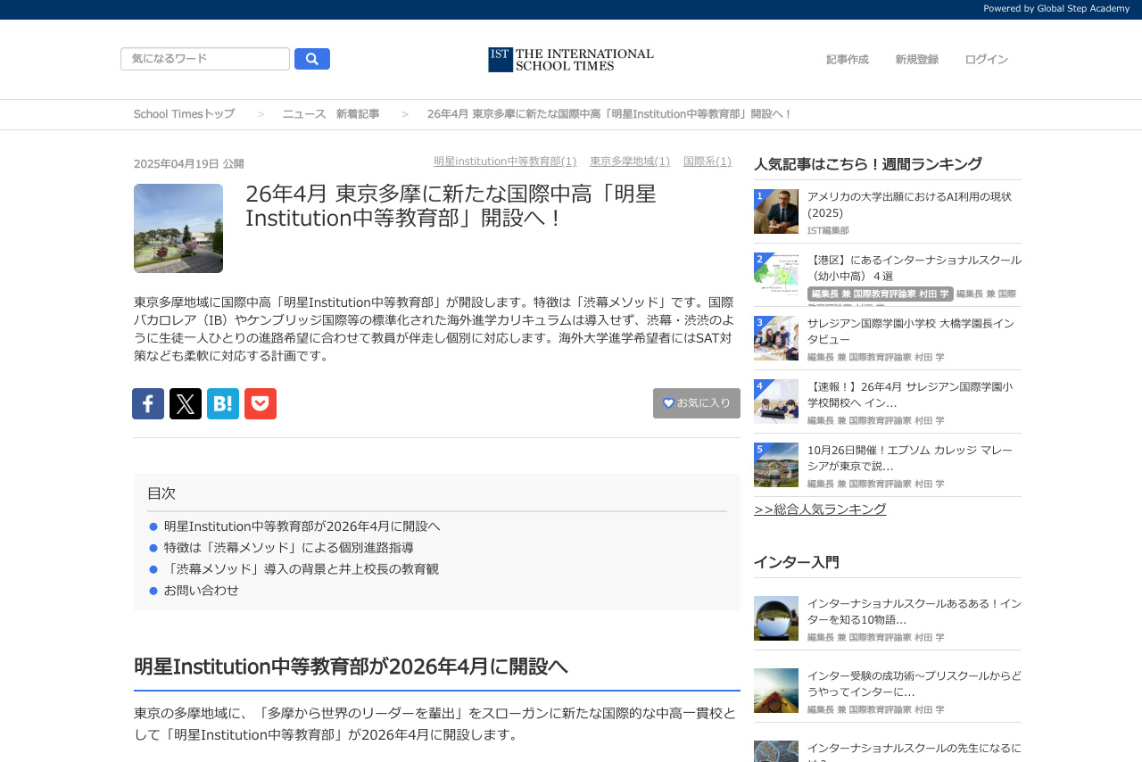 「THE INTERNATIONAL SCHOOL TIMES」(4月19日)に本校の記事が掲載されました